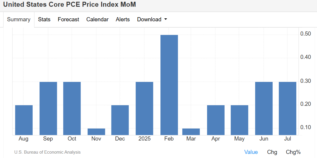 所谓的核心个人消费支出(核心PCE)物价指数(剔除食品和能源项目,该项指标为美联储所偏好的指标)较6月环比上升0.3%,与市场预期相符合。与上年同期相比,该指标升至2.9%,为2月以来最高,但是与市场普遍预期一致。整体PCE环比增长0.2%,同比增长2.6%,均与市场预期一致且显示出整体PCE指标企稳的迹象。