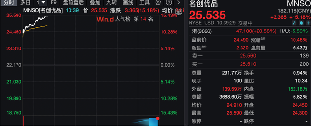 8月22日,美银证券发布研报指出,名创优品第二季度业绩超预期,收入和非国际财务报告准则净利润分别增长23%和11%,较一季度有所加速。非国际财务报告准则净利润超出该行预估14%,得益于收入超预期及更好的利润率。该行上调名创优品今明两年非国际财务报告准则每股盈利预测,目标价从32港元提至46.9港元。