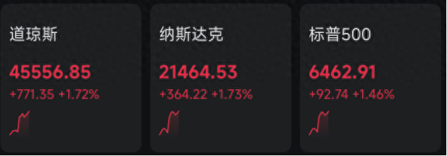 截至发稿,道指、纳指、标普500指数均涨超1%。黄金、白银直线拉升,COMEX黄金涨超1%、COMEX白银涨超2%。